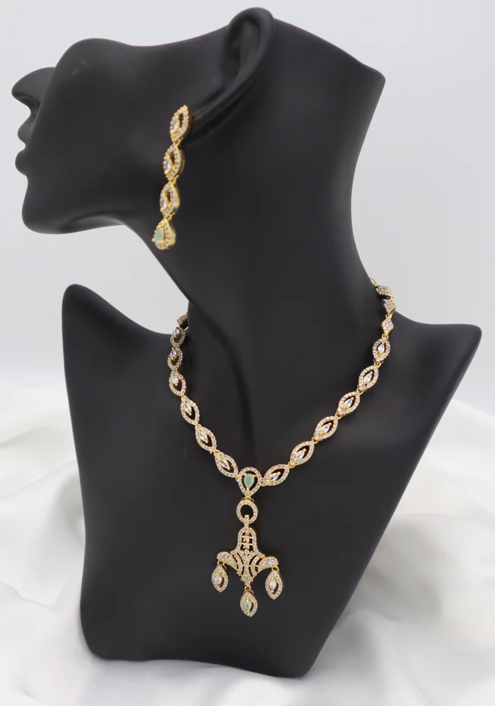 • Design: Linear earrings with interlinked oval/leaf elements, ending in a teardrop-shaped accent, matching the necklace.