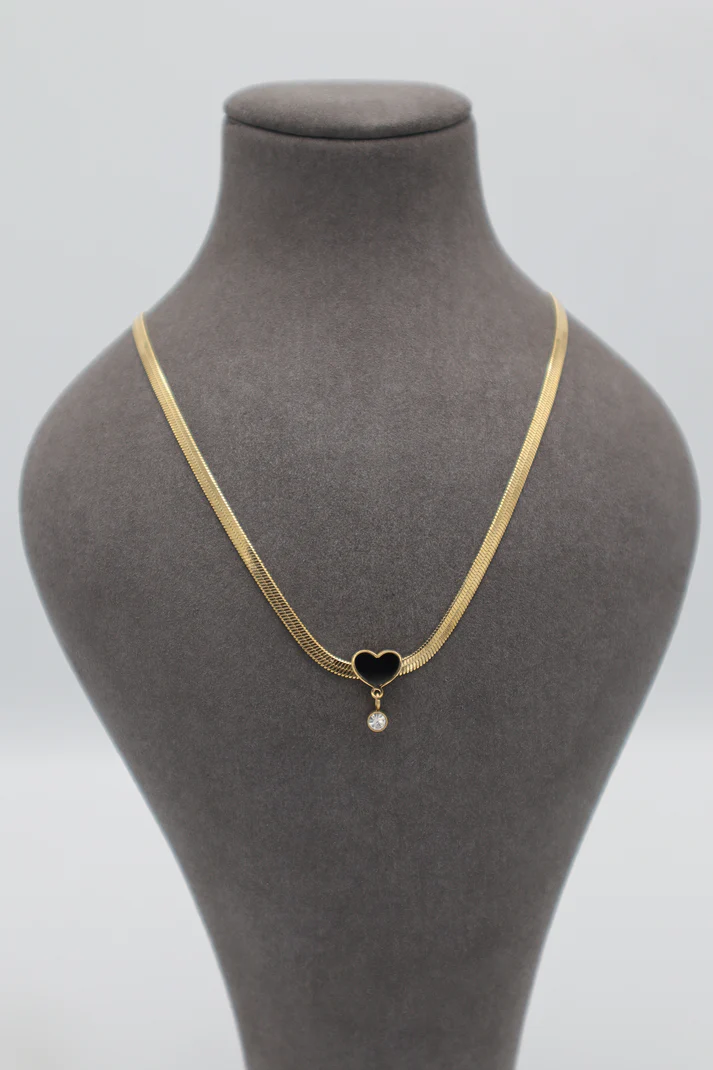 Elegant gold-plated stainless steel pendant featuring a sleek snake chain with a stylish black heart charm and a small crystal drop. A perfect blend of simplicity and elegance for everyday wear.