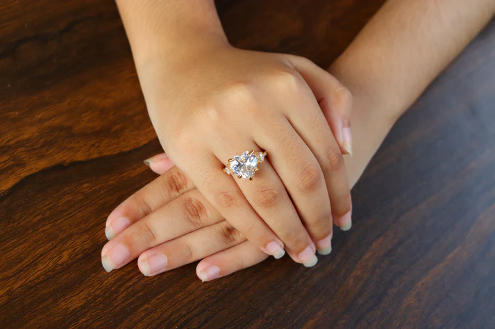 • Halo Setting: Clear accent stones encircle the heart-shaped center stone, enhancing its brilliance.