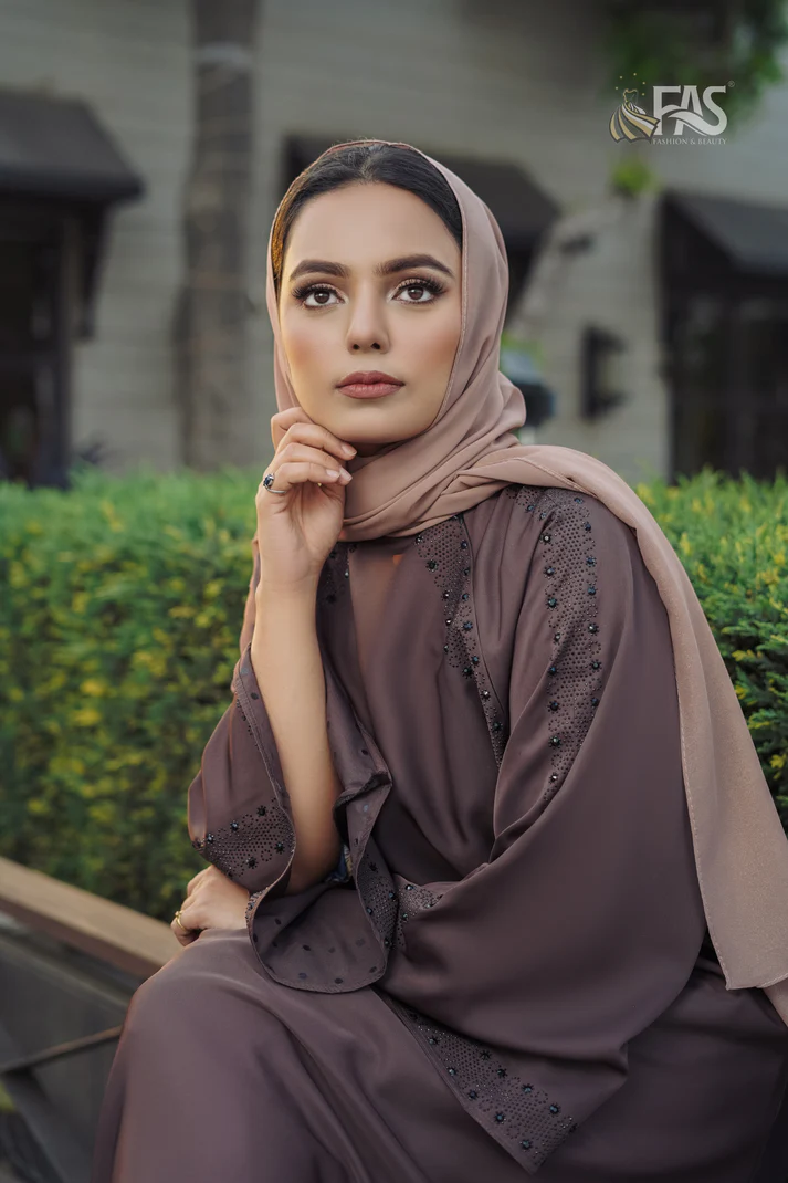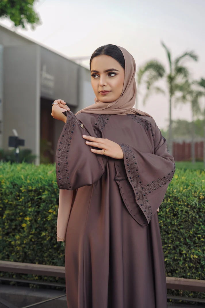 Embrace sophistication with this rich mauve abaya featuring a sleek and elegant finish. The batwing sleeves provide a graceful drape, ensuring both comfort and modesty. Delicate beaded embroidery adorns the shoulders, sleeves, and neckline, adding a refined touch of elegance.