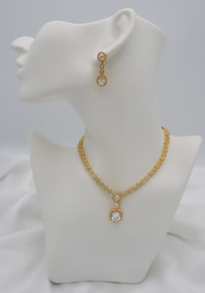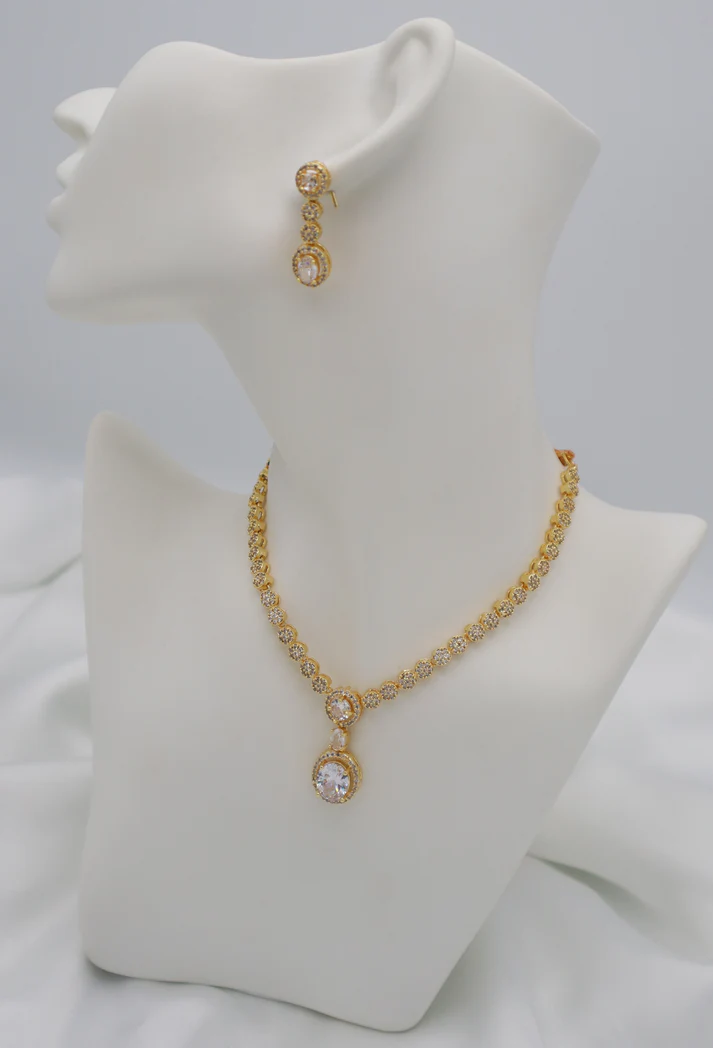• Design: Gold-tone chain with circular, floral-patterned links. Pendant features two linked white oval stones, each in a halo of tiny embellishments.