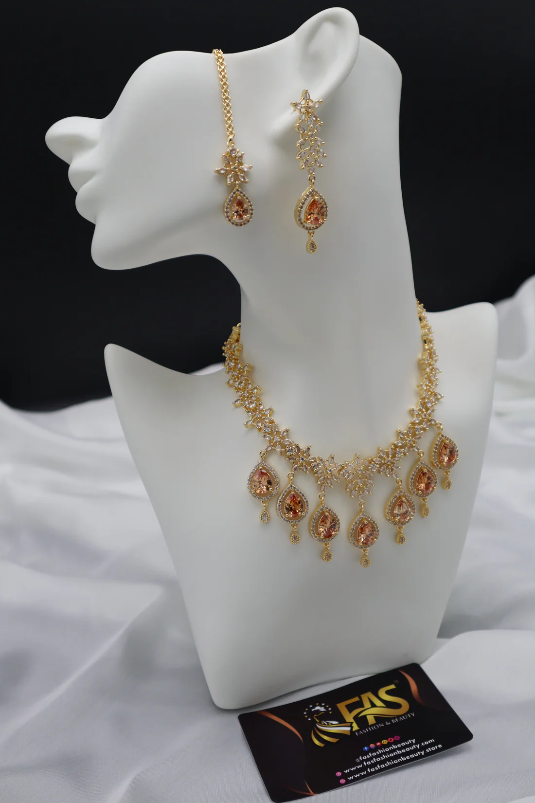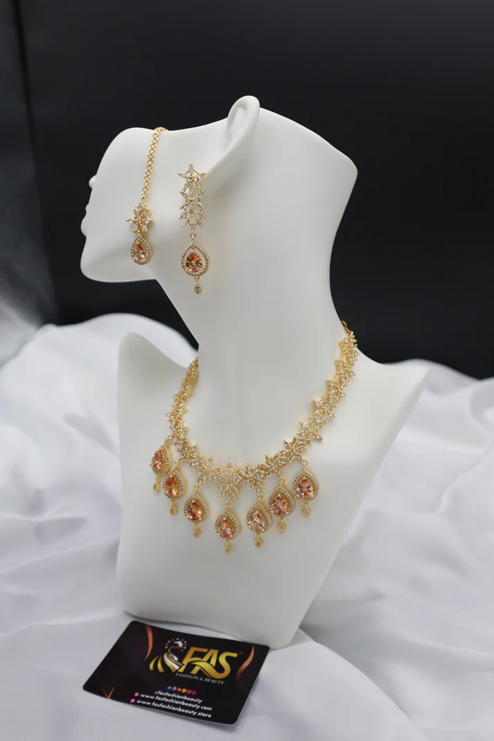 • Design: Floral centerpiece leading to a single tear-drop stone, matching the necklace and earrings.