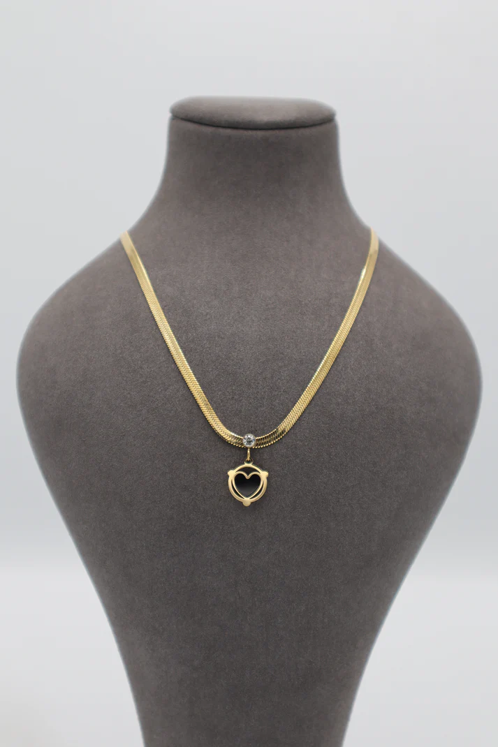 Sophisticated gold-plated stainless steel pendant featuring a graceful black heart charm framed in an elegant design and accented with a sparkling crystal connector. Paired with a sleek herringbone chain, this piece offers a refined and modern look, perfect for elevating everyday style or gifting someone special.
