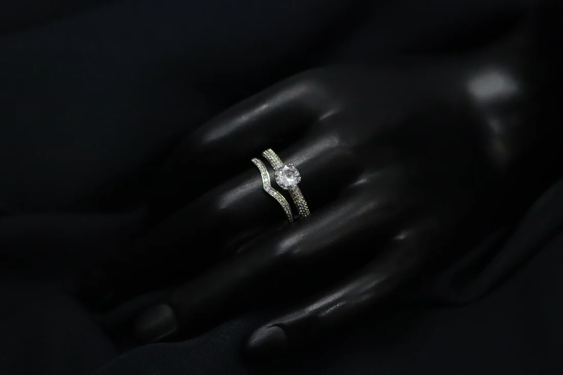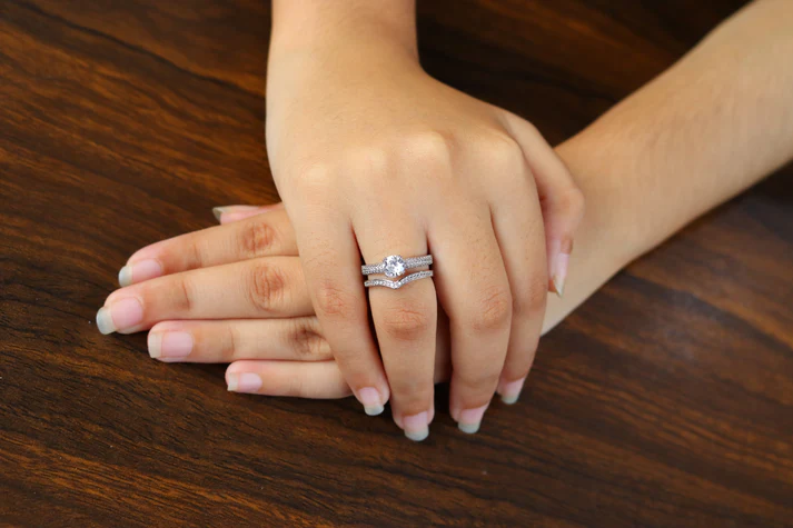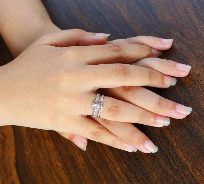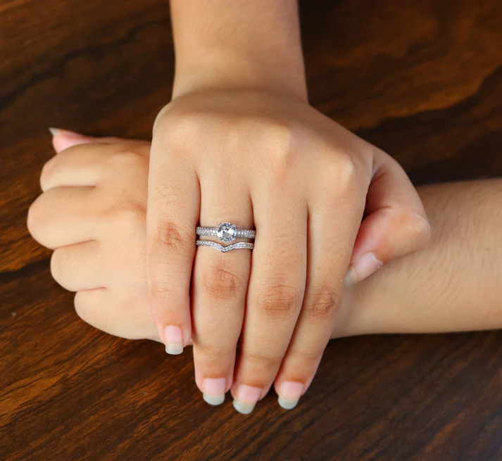 • Band Design: A SS silver-toned two pave-set bands, with the wedding band subtly contoured to fit the engagement ring design.