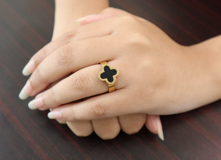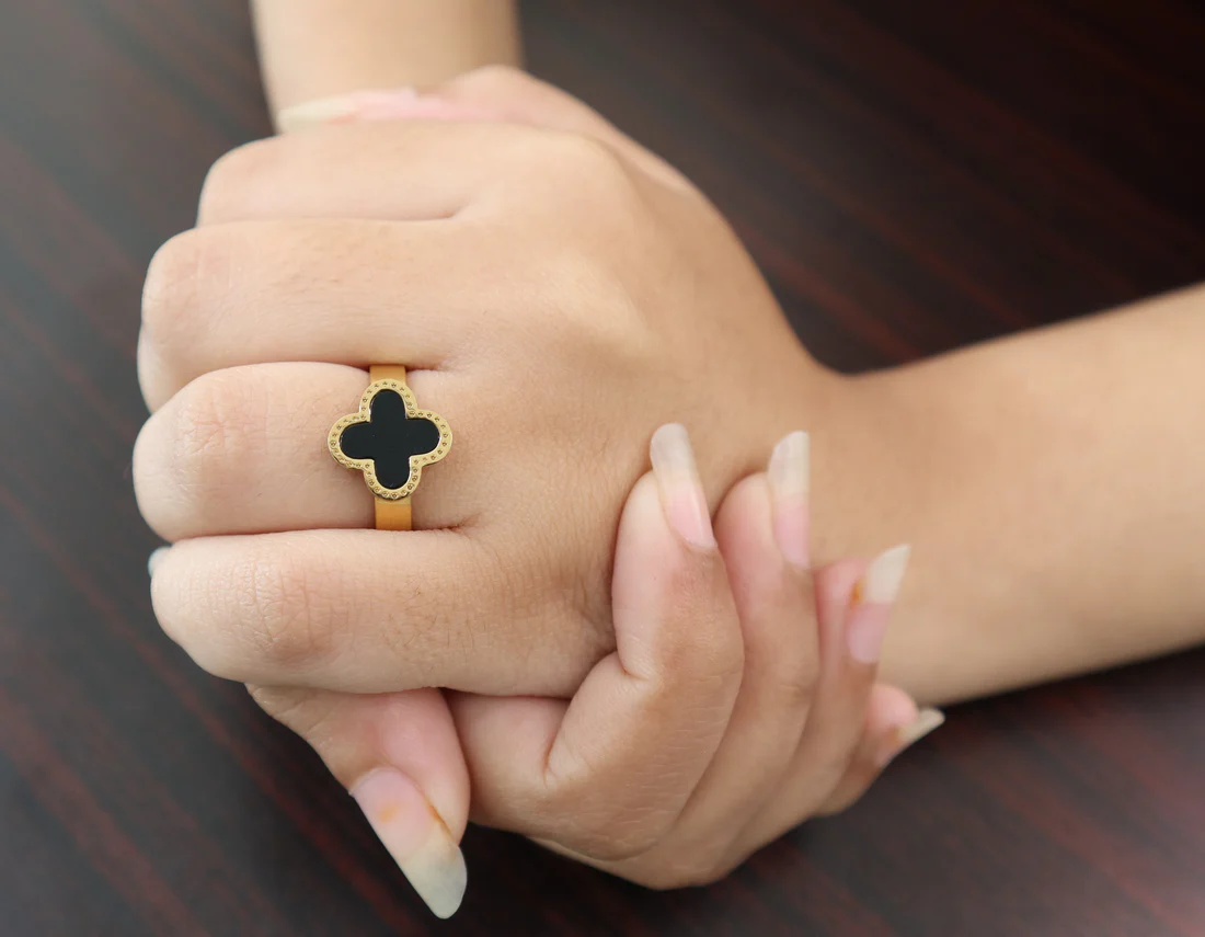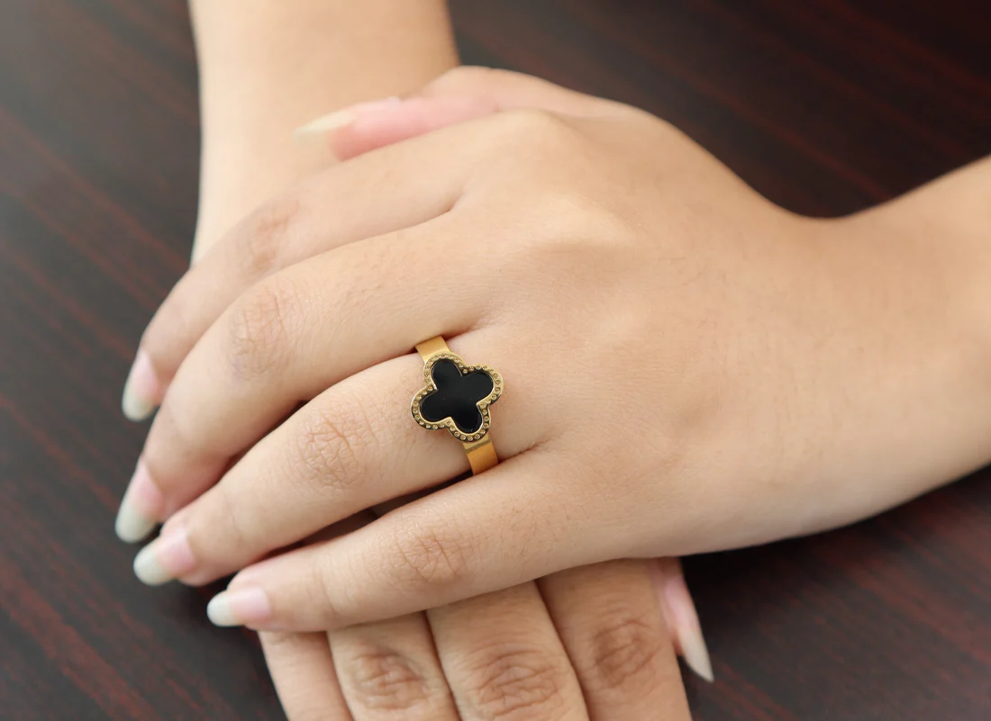 • Design: A delicate gold-toned band featuring a four-leaf clover-shaped centerpiece with a luminous black inlay. The edges are adorned with intricate black detailing.
