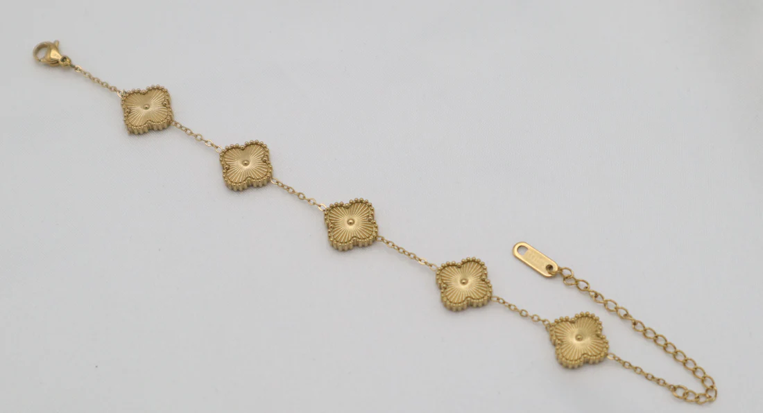 • Design: Elegant bracelet featuring alternating four-leaf clover-shaped motifs in golden, connected by delicate gold-toned chain links.