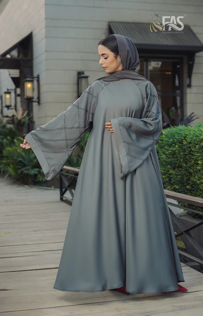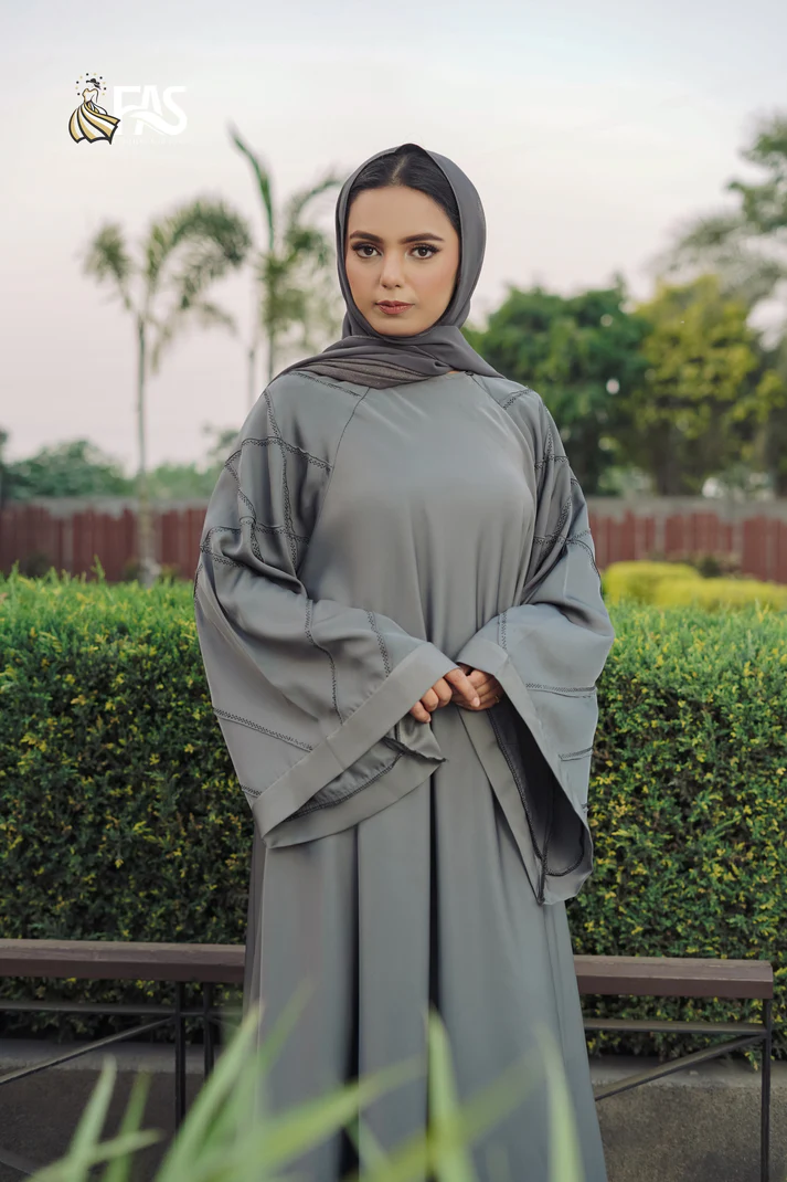 Exude modern elegance with this sleek gray abaya, featuring a subtle stitched crisscross pattern on the batwing sleeves for a structured yet graceful touch. The flowy silhouette ensures effortless sophistication, while the round neckline keeps the look refined and versatile.