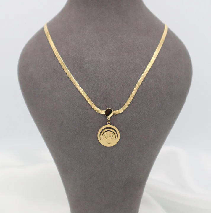 - Design: A round gold-toned pendant featuring an engraved crown emblem, symbolizing power and elegance.