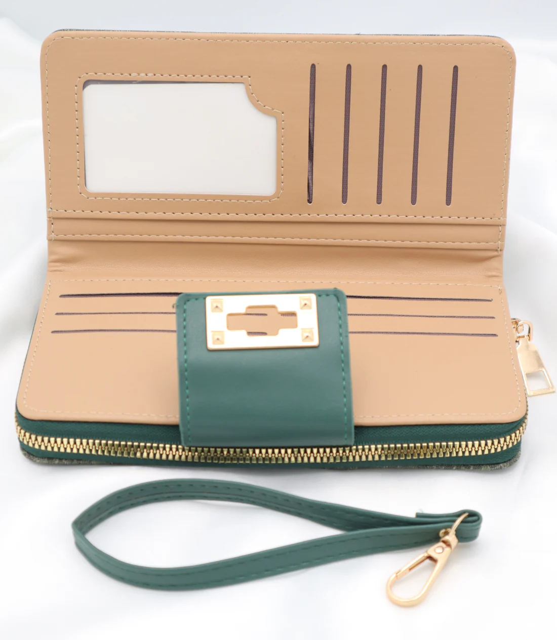 Full-length zipper with smooth gold detailing.