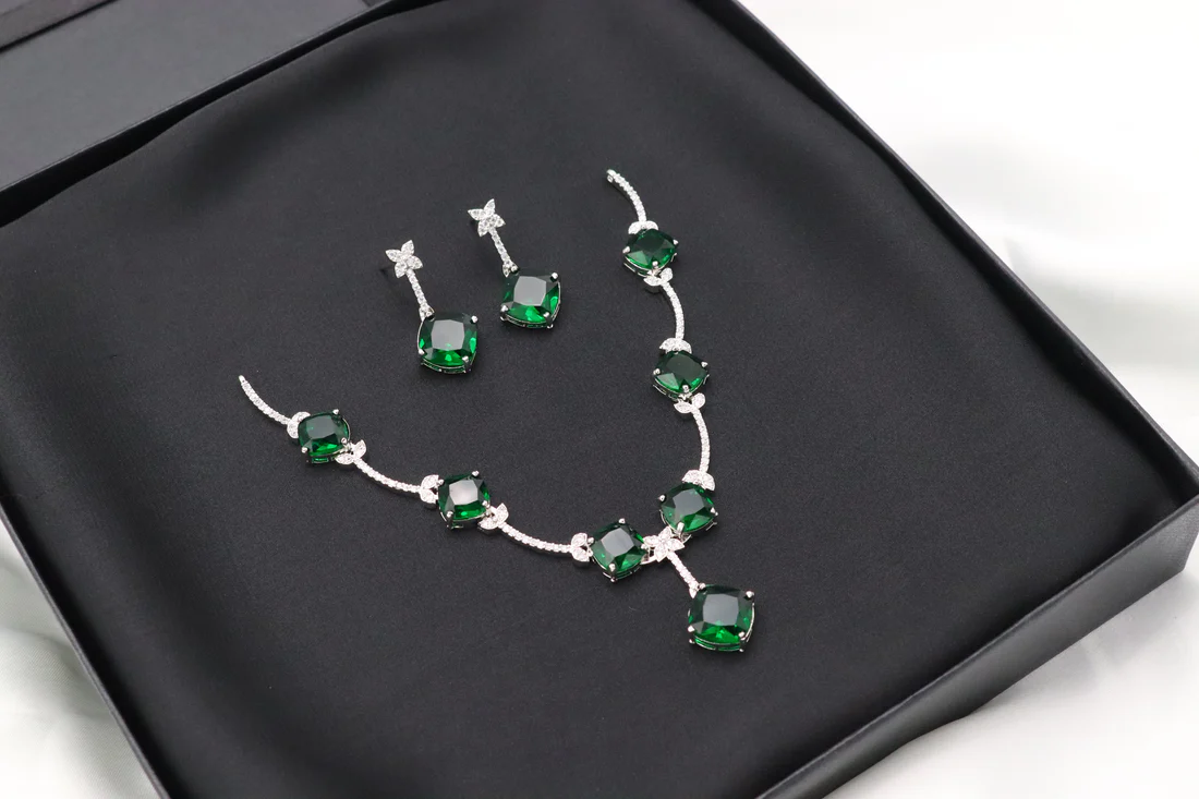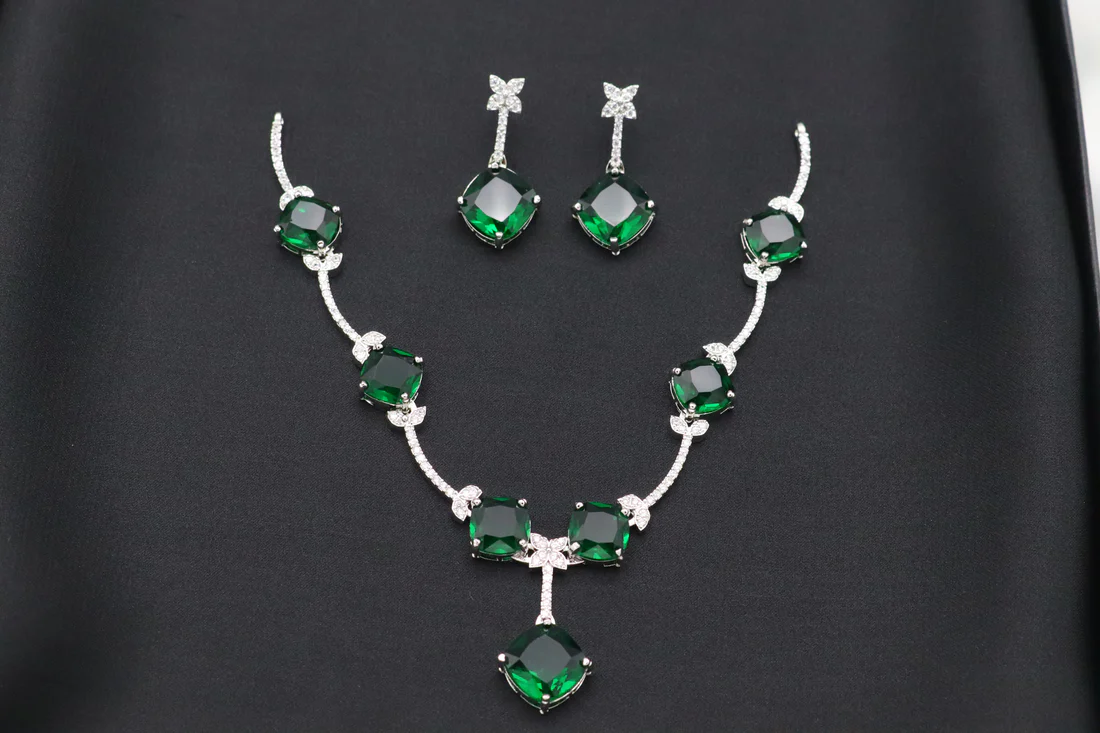 • Design: Choker-style necklace featuring cushion-cut green gemstones connected with delicate zirconia accents, with a larger green gemstone as the centerpiece.