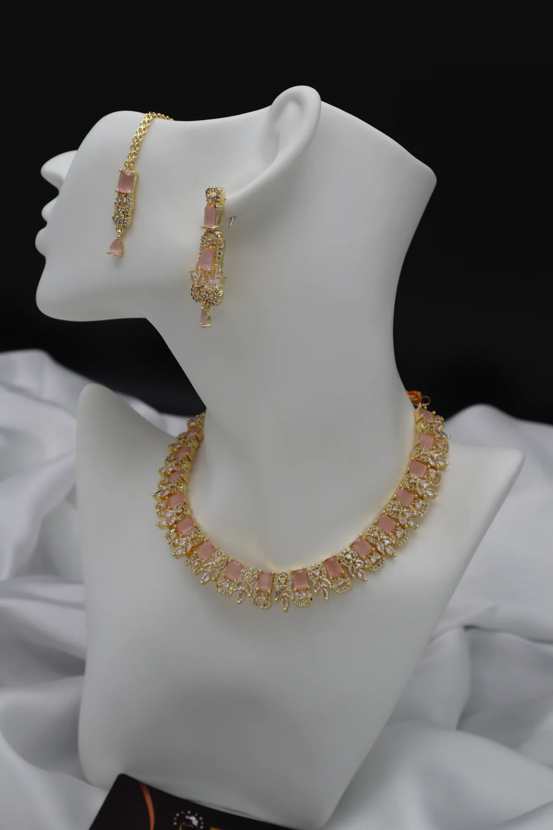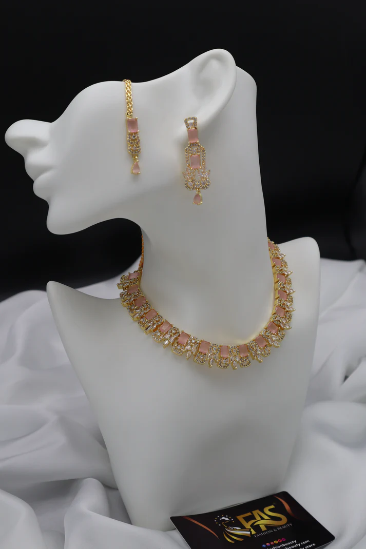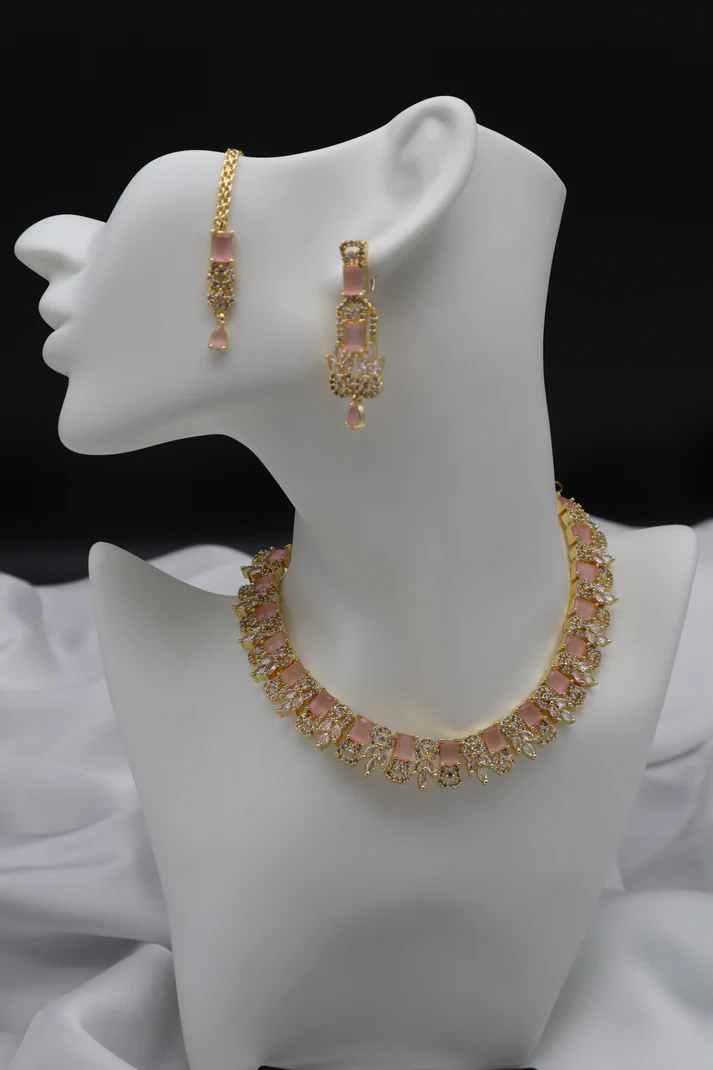 • Stone Setting: Matte pink rectangular stones paired with sparkling clear stones.
