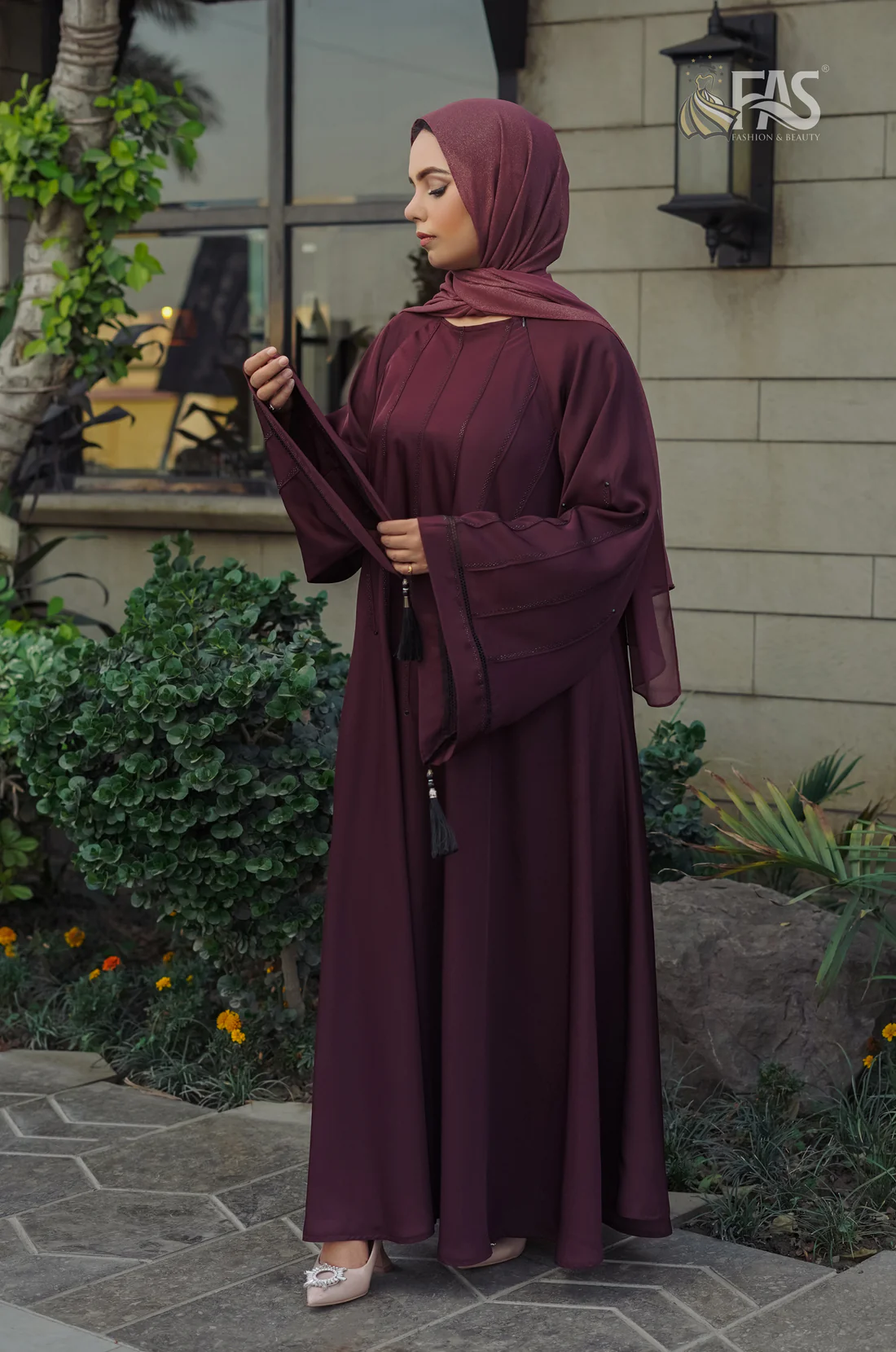 A sophisticated plum abaya featuring intricate stitched details and flared sleeves with delicate pleats. The flowing silhouette adds a graceful touch, making it a versatile choice for both casual and formal wear.
