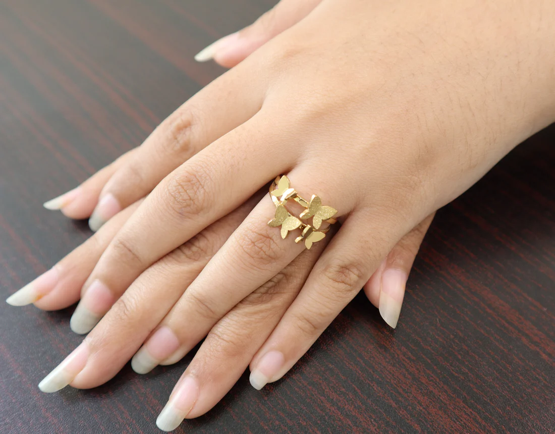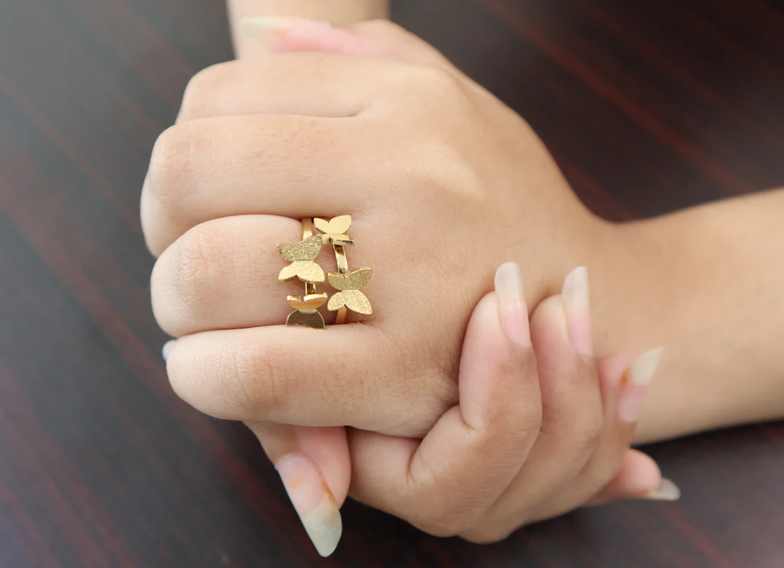 • Design: A whimsical and delicate piece featuring multiple butterflies arranged in a free-flowing design. The butterflies have a mix of polished and textured finishes.