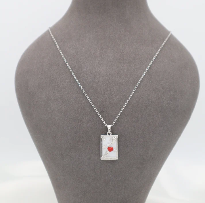 - Design: A rectangular frame pendant adorned with a dainty red heart accent, enhanced with a sparkling stone to add a touch of brilliance.