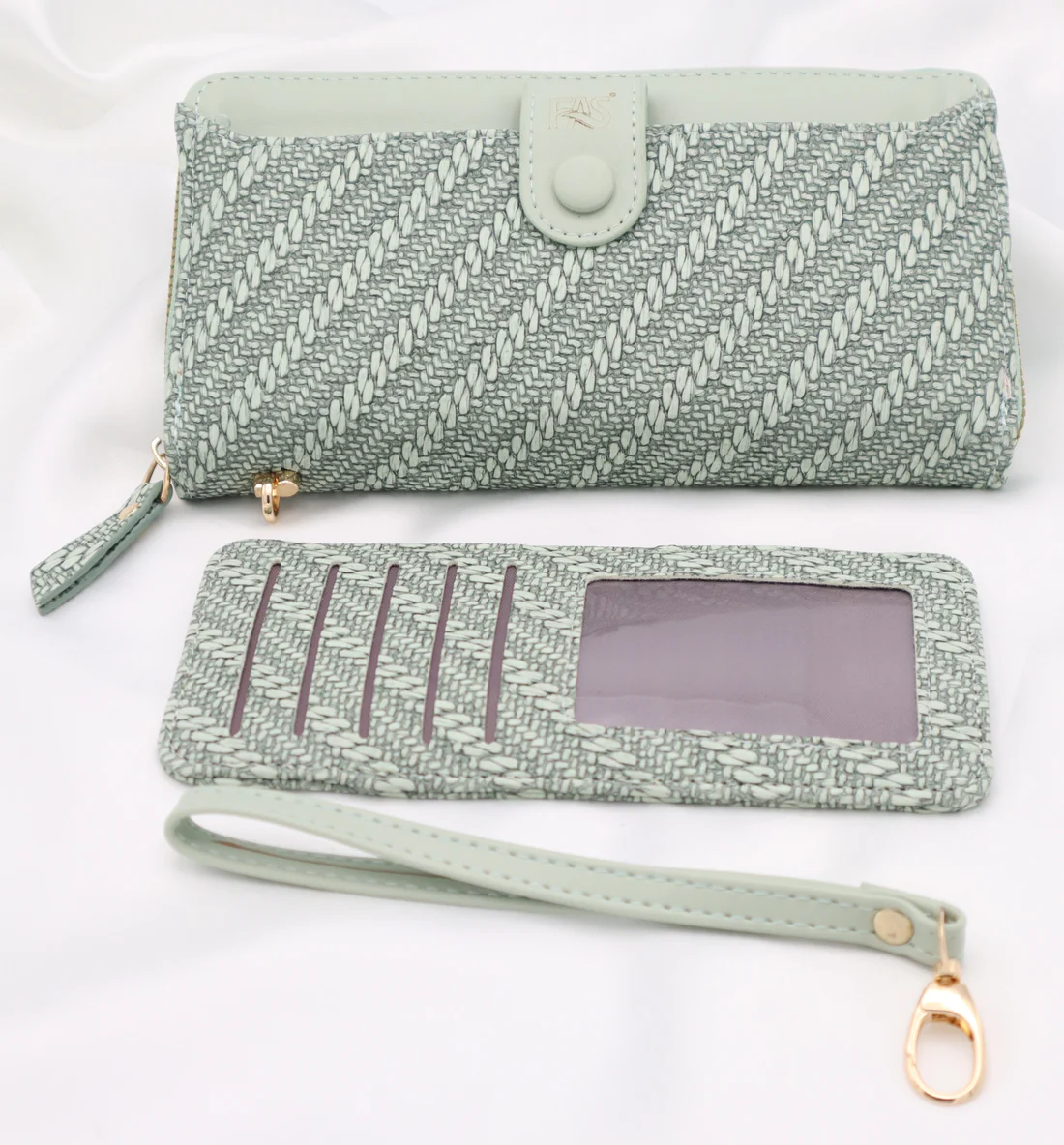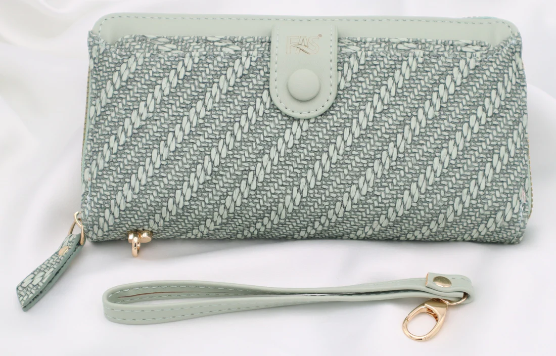 Green with a woven-texture fabric and faux leather combination.