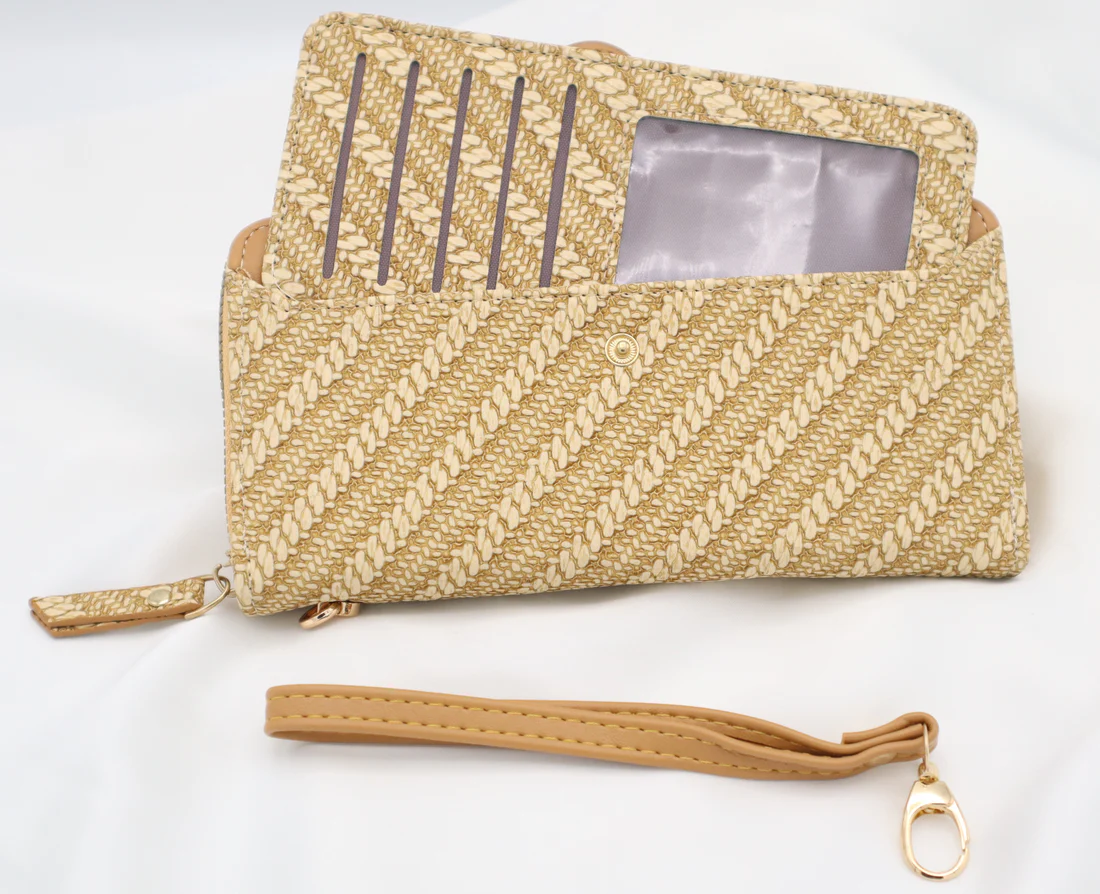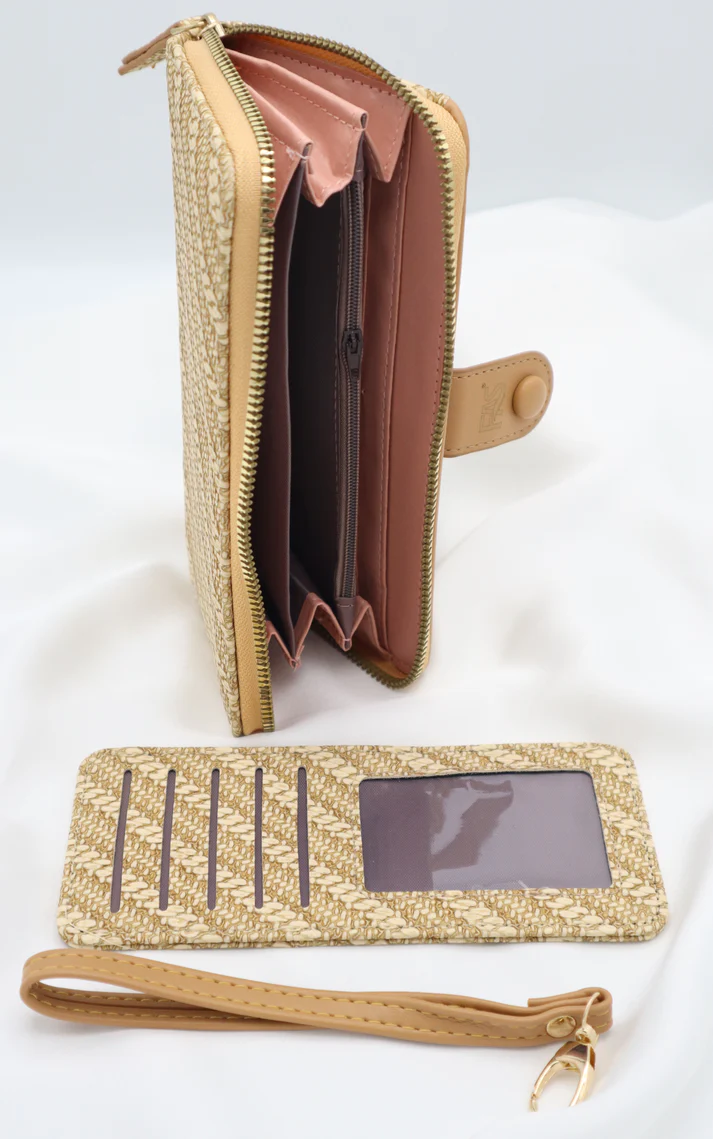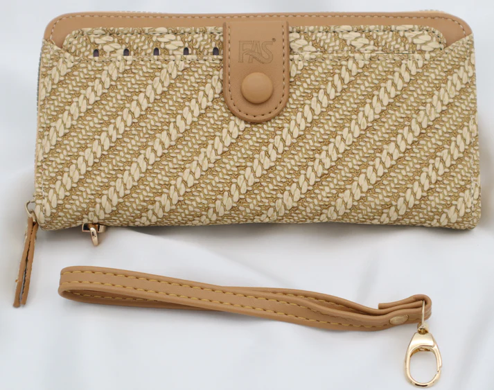 Soft light brown with a woven-texture fabric and faux leather combination.