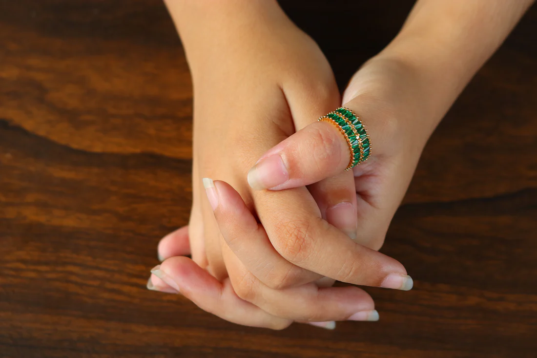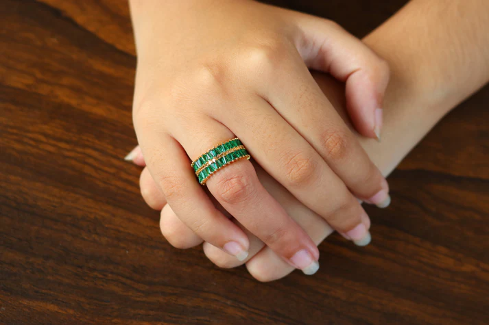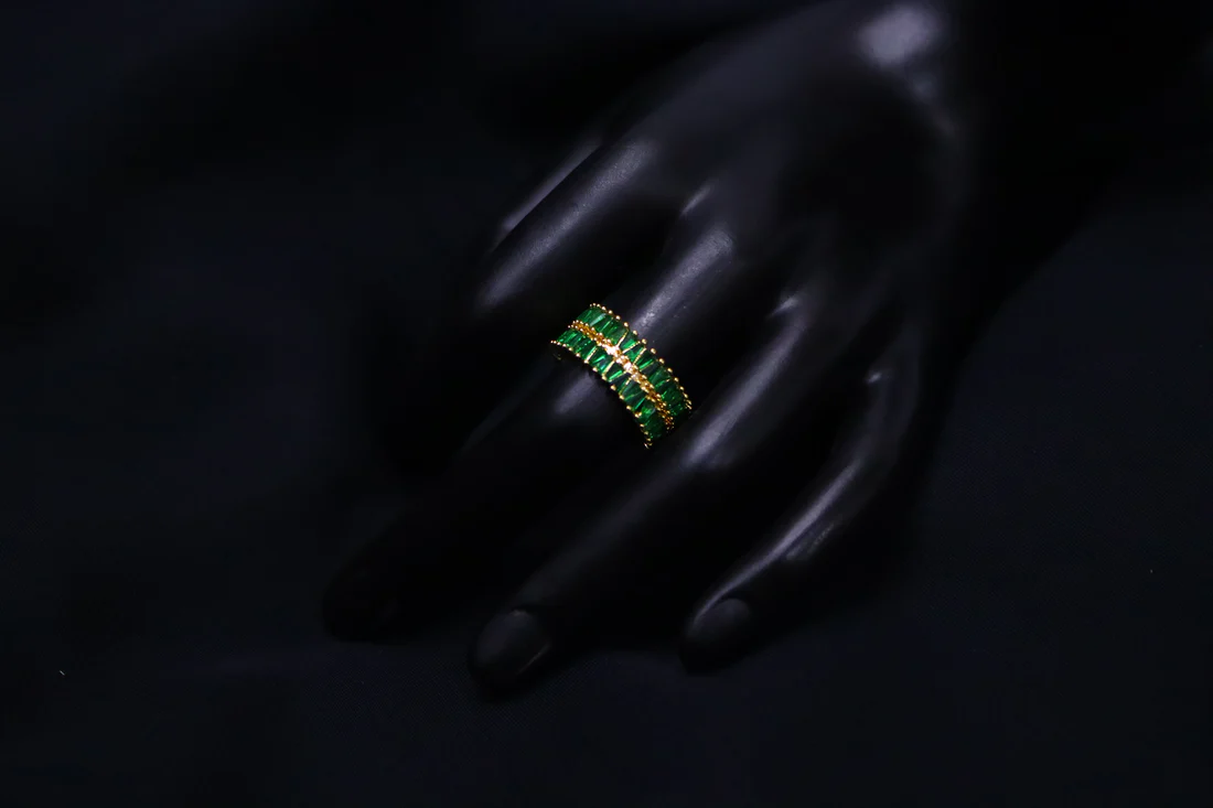 • Center Stone: Two parallel rows of green, rectangular baguette-cut cubic zirconia (CZ) stones, positioned in a channel setting.