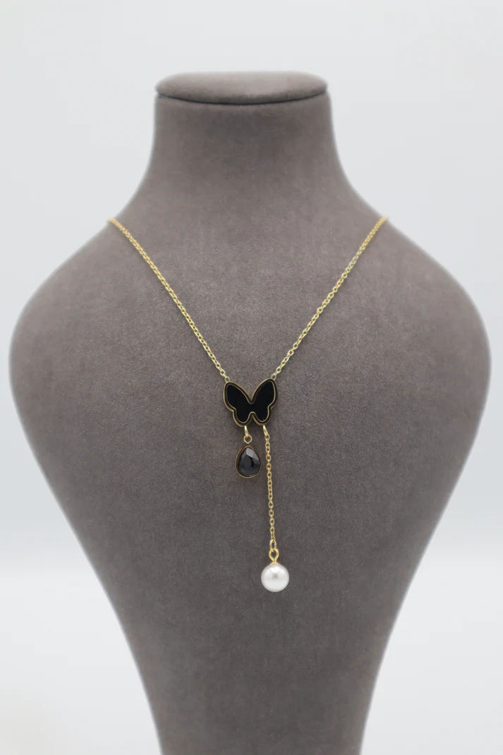 Graceful gold-plated stainless steel pendant featuring a butterfly design accented with a dangling black crystal drop and elegant pearl charm. The delicate chain and flowing drop style create a sophisticated and feminine look, making it a perfect accessory for both everyday wear and special occasions.