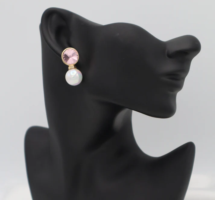 • Design: A striking light pink circular stud, set in a gold-toned frame, paired with a delicate pearl drop for a bold yet elegant contrast.