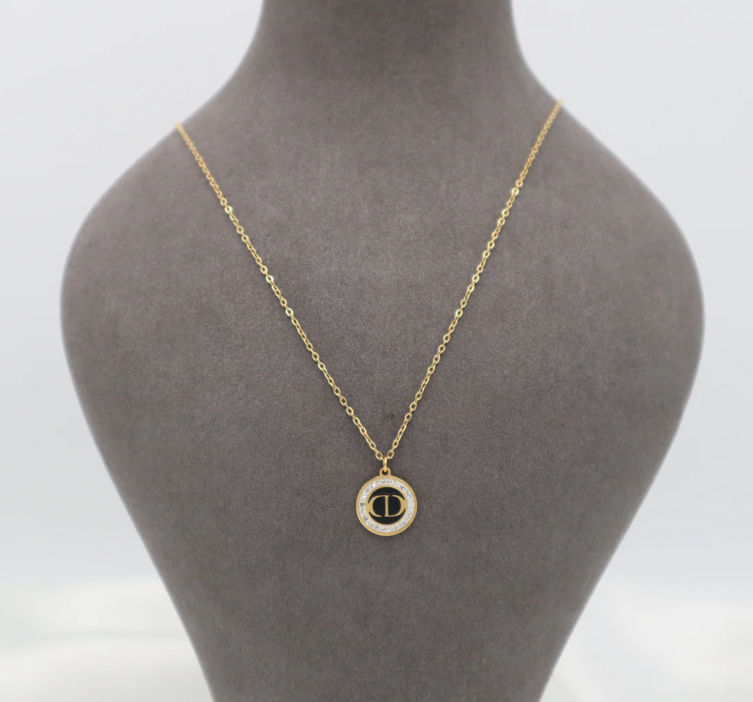 - Design: A gold-toned round pendant featuring a dark center stone, adding a bold and luxurious contrast.