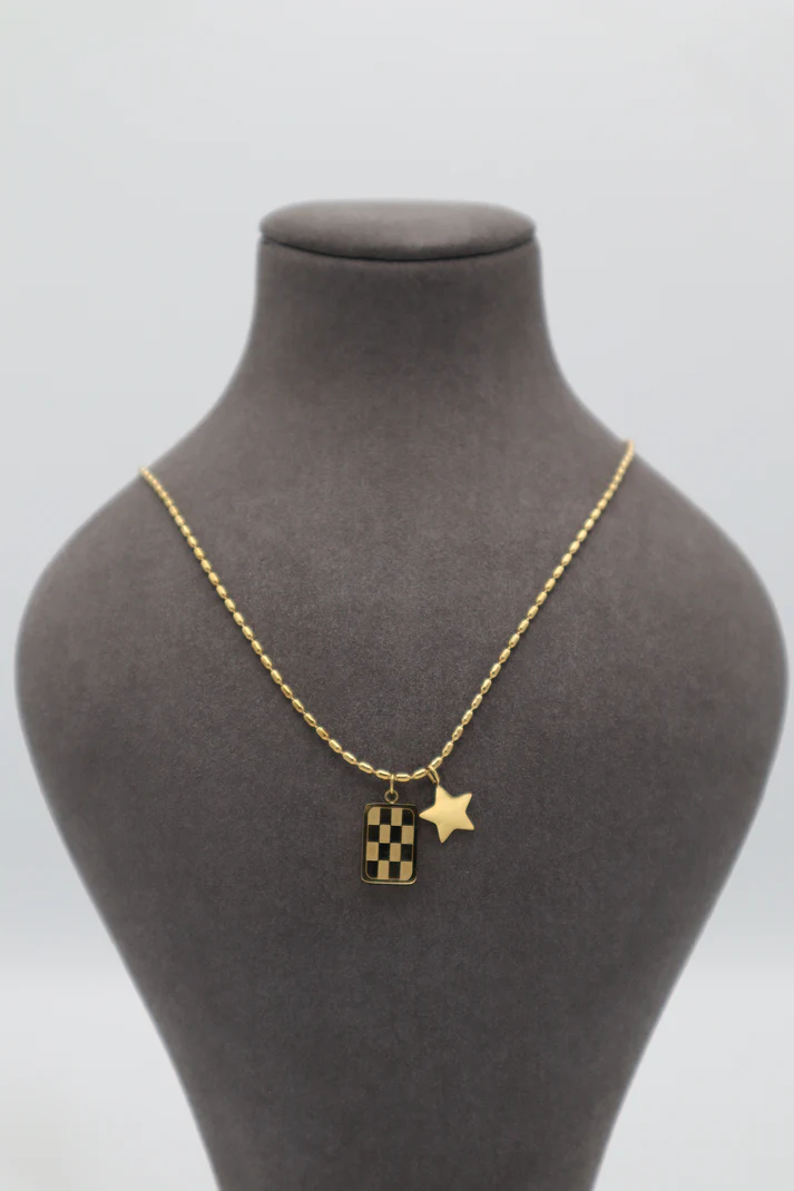 Stylish gold-plated stainless steel pendant featuring a unique dual charm design with a checkered rectangular tag and a sleek star charm. A modern and playful piece that adds a trendy touch to your everyday look.