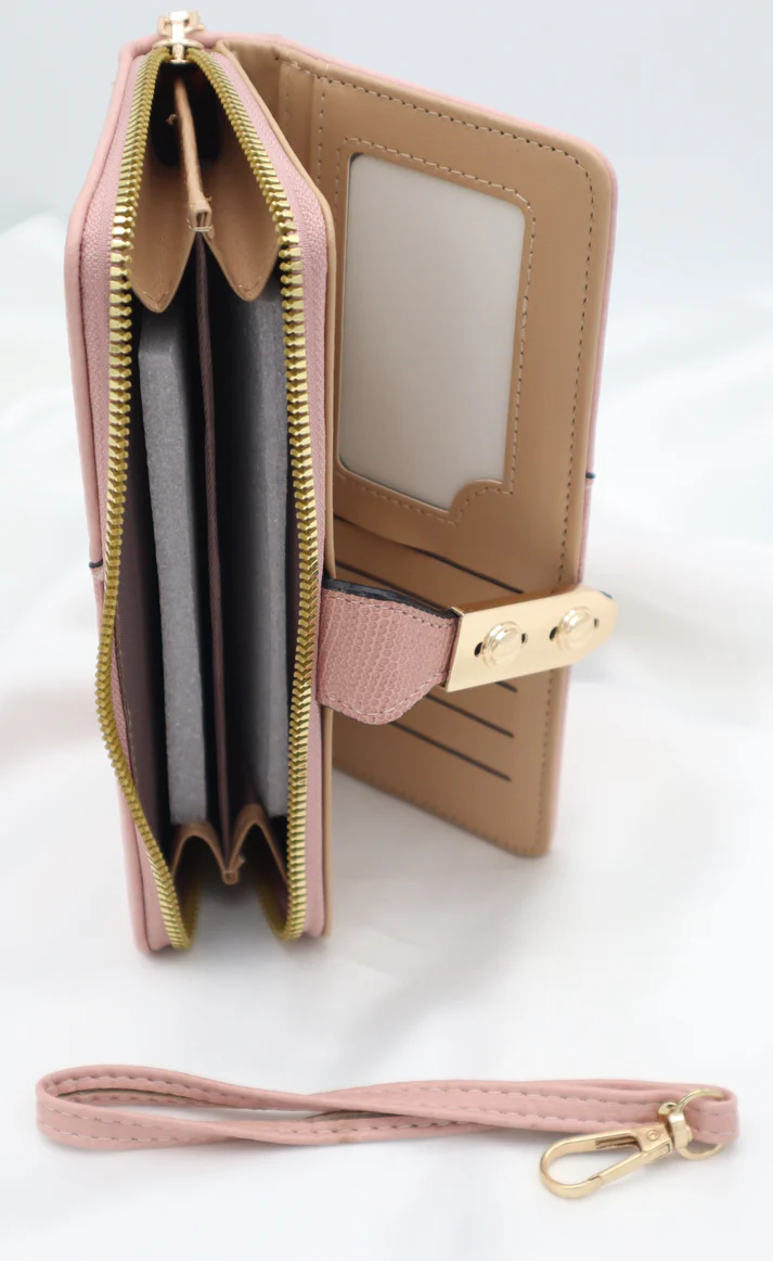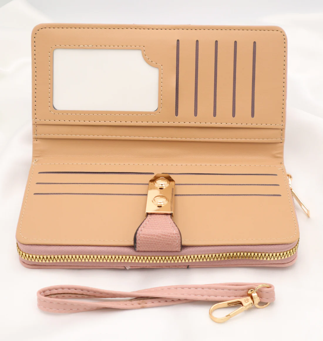 Smooth gold zipper along the edges for secure storage.