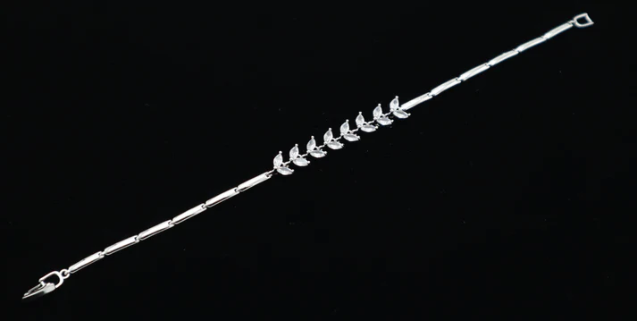 - Design: The bracelet featuring elongated rectangular links, complemented by a central section of leaf-like, chevron-shaped links arranged symmetrically.